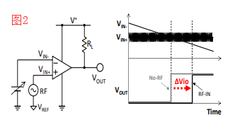 圖1和圖2顯示了運算放大器和比較器的失調電壓偏移,當射頻信號被照射時從簡單的天線到安裝設備的測試板,設備的輸入偏移電壓會波動,并導致晶振輸出信號偏移或閾值電壓偏移,我們在本應用筆記中將此現象稱為"偏移電壓偏移",這種"偏移電壓偏移"可能導致故障電子設備,RF信號傳播到器件,引起偏移電壓偏移,其所考慮的RF信號線包括PCB圖案,電纜,封裝的引線和器件的鍵合線,但是,由于RF信號的波長(例如,在2.4GHz處為13cm,在900MHz處為33cm)足夠長封裝引線和焊線(幾毫米),PCB圖案或電纜通常用作天線,何時用作天線RF信號到達引腳,導致偏移電壓偏移.