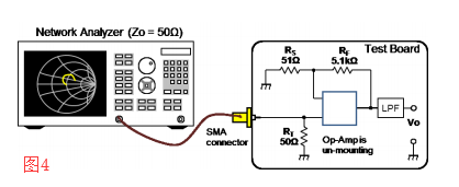 圖3顯示了運算放大器的EMIRR測量電路,在比較器的情況下,添加一個NULL放大器測量偏移電壓,EMIRR測量需要SMA電纜和連接器來連接測試板和信號因為它處理GHz頻帶的高頻信號,并且測試板將RF信號發送到IC微帶線附近,+IN端子引腳應為50Ω微帶線,以匹配RF布線和射頻發生器的阻抗,在PCB上使用50Ω端接,該終端電阻用于作為提供運算放大器直流偏置的角色,并且,為了減少RF信號的影響,應插入低通濾波器在輸出端子和電壓表之間,將RF信號幅度(VRF_PEAK)設置為100mVP和電壓增益(Gv)到101次. RF信號在測量中以寬頻率范圍掃描,這是通過微帶傳輸的線,但是,很難讓50Ω完全匹配從低頻到高頻的阻抗,因此石英振蕩器在定量測量中通過校準來校正RF信號的輸入電平是必要的,正如所示圖4中,輸入RF信號的修正量是通過測量OP-Amp中的測試板阻抗ZL來確定的而比較器沒有網絡分析儀的安裝狀態,通過測量的ZL確定信號發生器"VSG"的輸出電壓在每個頻率變為VRF_PEAK=100mVP. 在安裝的測試板裝置中,RF信號在高頻率下對輸入端子的阻抗的影響而波動帶,該波動量被認為包含在電磁波干擾信息庫特性中,因此RF信號波動沒有校準,如果將高于輸入端的電壓提供給輸出端,則IC可能會被破壞,安全工作區控制電路保護輸出傳輸晶體管在安全工作范圍內運行通過在輸入-輸出差分電壓增加貼片振蕩器時減小輸出電流來減小面積.