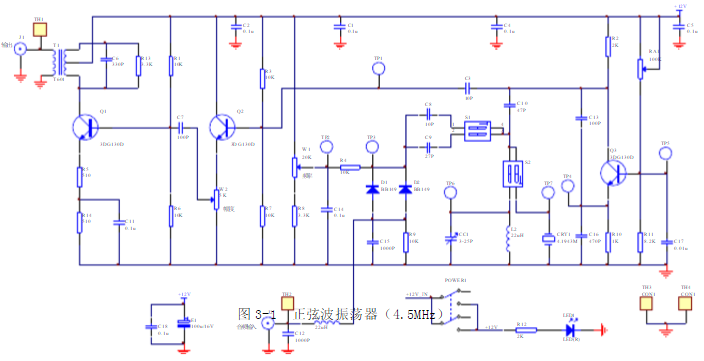 信號流程:Q3振蕩至Q2跟隨至Q1諧振選頻放大輸出;調頻W1(壓控調諧,電調諧),調幅W2