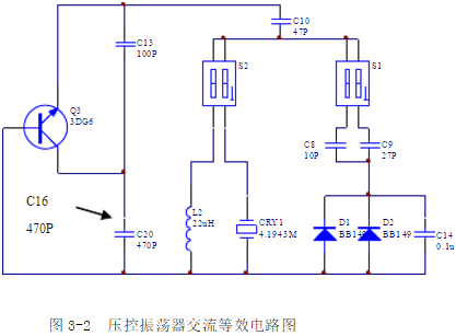 2.壓控振蕩器(VCO):將1S的1或2撥上,2S的1撥下、2撥上(不接CRY1石英晶體),則變容二極管1D、2D并聯在電感2L兩端。當調節電位器W1時,1D、2D兩端的反向偏壓隨之改變,從而改變了1D和2D的結電容Cj,也就改變了振蕩電路的等效電容,使振蕩頻率發生變化。其交流等效電路如圖3-2所示。