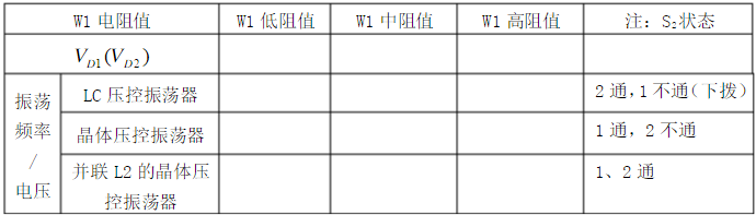2)將W1從低阻值、中阻值到高阻值位置,分別將變容二極管的反向偏置電壓(萬用表測)、輸出頻率和輸出電壓記于下表3-2中。