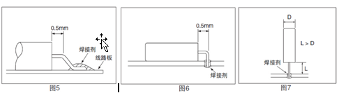 彎曲導(dǎo)腳的方法(1) 將導(dǎo)腳彎曲之后并進行焊接時,導(dǎo)腳上要留下離外殼0.5mm的直線部位。如果不留出導(dǎo)腳的直線部位而將導(dǎo)腳彎曲,有可能導(dǎo)致玻璃的破碎 (參閱圖5 和圖6)。(2) 在導(dǎo)腳焊接完畢之后再將導(dǎo)腳彎曲時,務(wù)必請留出大于外殼直徑長度的空閑部分 (參閱圖7)。如果直接在外殼部位焊接,會導(dǎo)致殼內(nèi)真空濃度的下降,使晶振特性惡化以及晶振芯片的破損。應(yīng)注意將晶振平放時,不要使之與導(dǎo)腳相碰撞,請放長從外殼部位到線路板為止的導(dǎo)腳長度 (L) ,并使之大于外殼的直徑長度(D)。