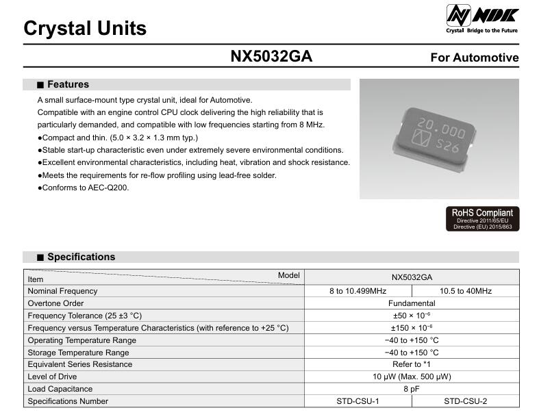 | NX5032GA-20.000M-STD-CSU-2 | NDK | CRYSTAL 20.0000MHZ 8PF SMD | ±50ppm | -40°C ~ 150°C | 2 | 5032 |
