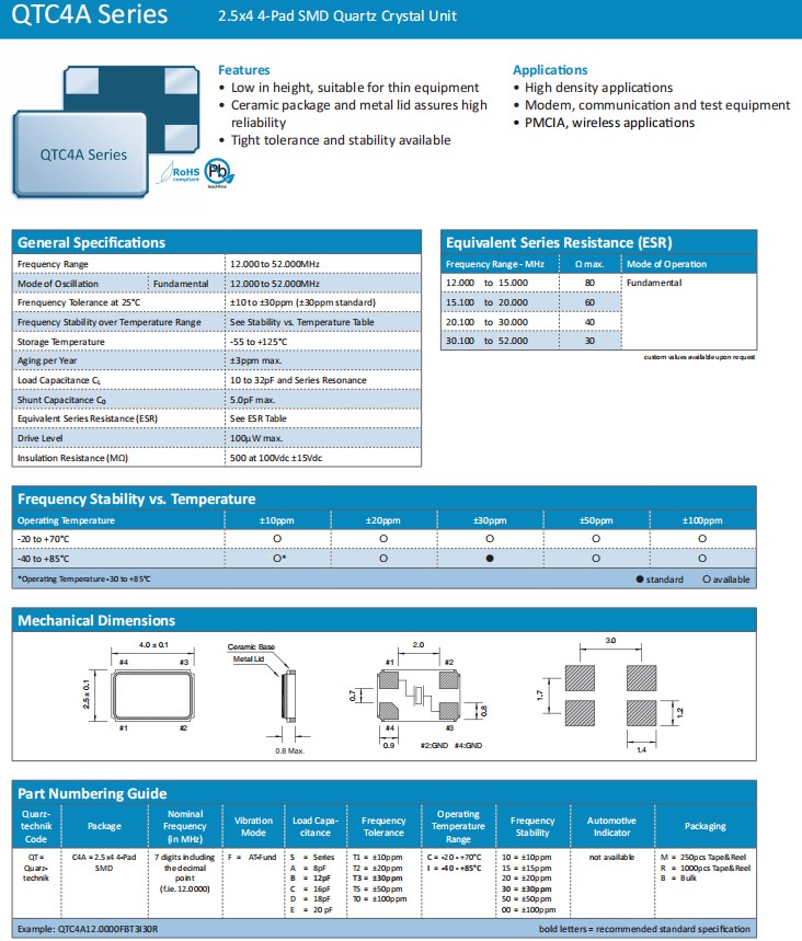 Quarztechnik夸克石英晶體,QTC4A無源晶振,QTC4A12.0000FBT3I30R晶振