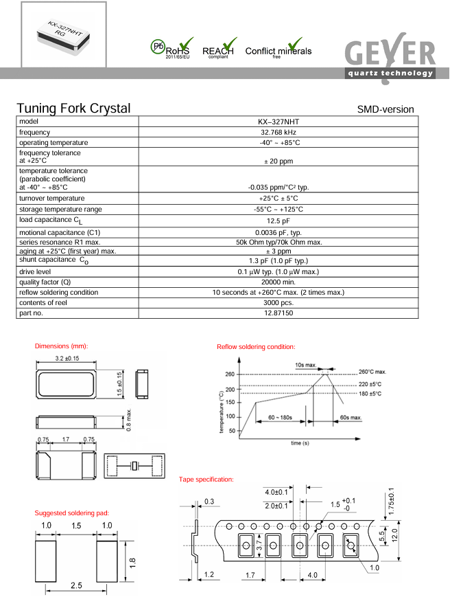 | 12.87154 | GEYER | CRYSTAL 32.768KHz 12.5pF SMD | KX-327NHT | ±20ppm | -40°C ~ 85°C | 2 | 3215 | Geyer |