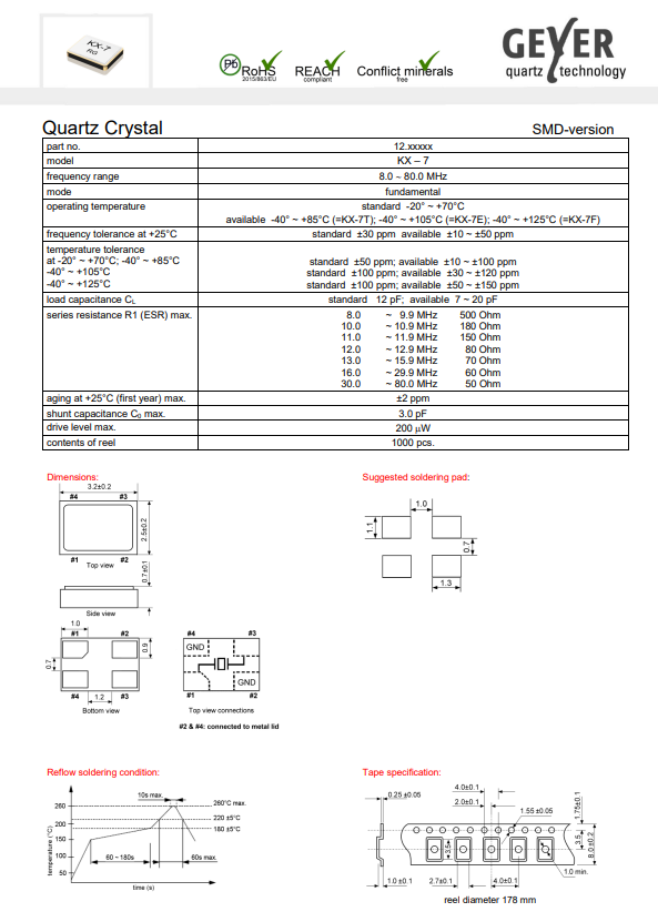 | 12.88565 | GEYER | Crystal 8.0Mhz 12pF SMD | KX-7E | ±30ppm | -20°C ~ 70°C | 4 | 7015 |