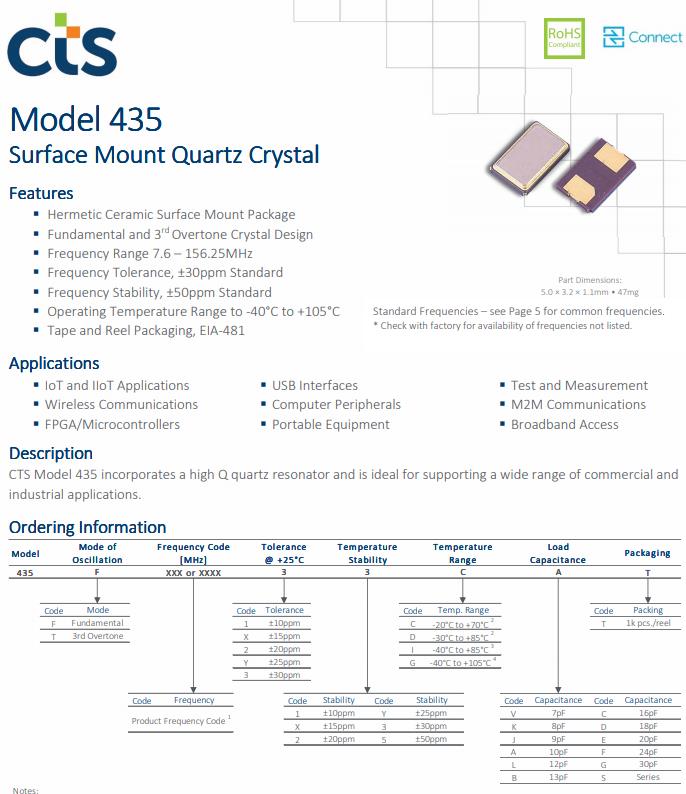 CTS晶振公司推出的435型的標(biāo)準(zhǔn)產(chǎn)品特性和常見市場(chǎng)應(yīng)用總結(jié)如下。