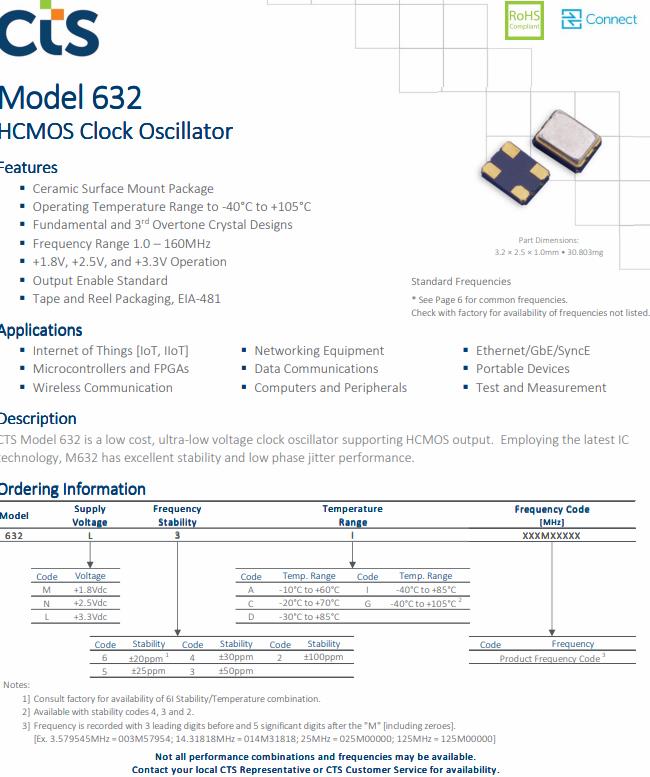 CTS有源晶振應用程序:物聯網[IoT, IIoT],微控制器和fpga,無線通信,網絡設備,數據通信,計算機和外圍設備,對以太網/ GbE / SyncE,便攜式設備,測試與測量.CTS優異穩定性的XO振蕩器是數據通信最佳的選擇632L3I040M00000.