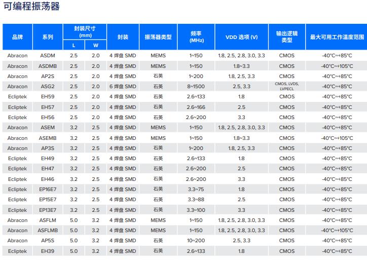 編程能力使 Abracon有源貼片晶振 和 Ecliptek 品牌能夠提供以下功能: