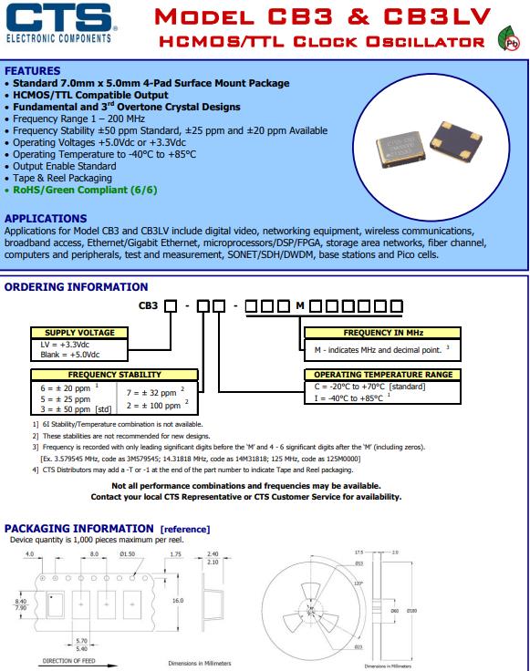 編碼CB3-3C-24M0000,是具有成本效益,低損耗的石英晶體振蕩器,頻率24MHz,XO(標準)時鐘晶振,電壓5V ,啟用/禁用, 4-SMD,無引線,標準7.0mm x 5.0mm 4-Pad表面安裝包,HCMOS/TTL兼容輸出,基本和第三泛音水晶設計,頻率范圍1 - 200 MHz,頻率穩定性±50ppm標準,±25ppm和±20ppm可選,工作電壓+5.0Vdc或+3.3Vdc,工作溫度-40°C至+85°C,輸出啟用標準,磁帶和卷筒包裝.