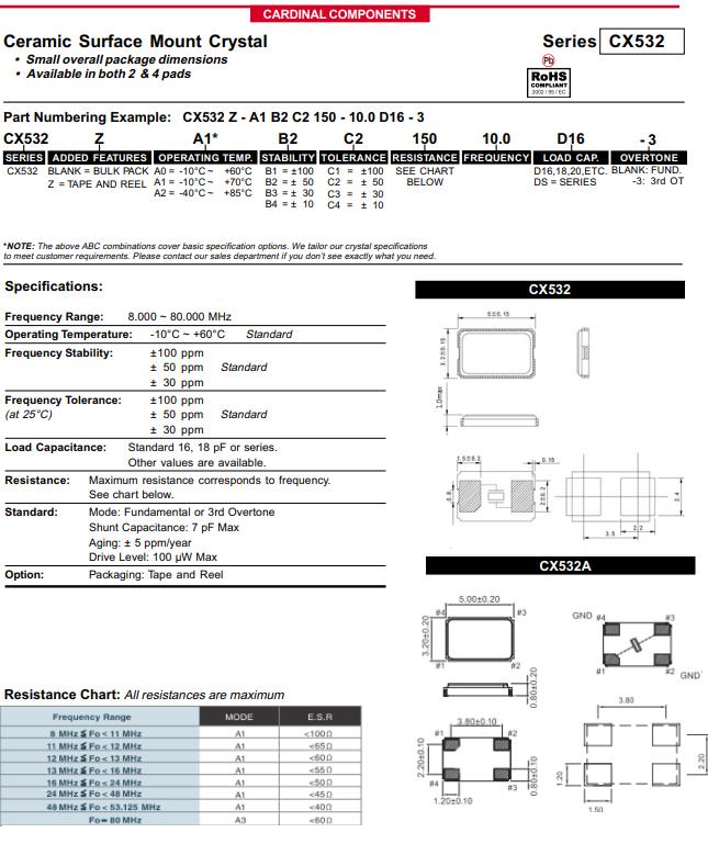 | CX532Z-A2B3C5-70-20.0D18 | Cardinal晶振 | CRYSTAL 20.0000MHZ 18PF SMD | CX532 | MHz Crystal | 20MHz | ±30ppm |