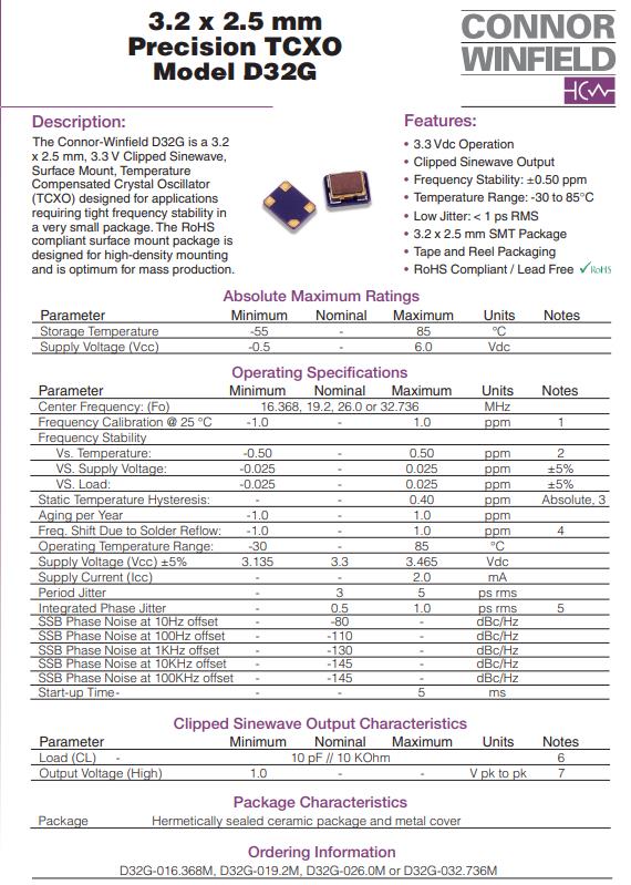 Connor-Winfield宣布新的超微型精密3225mmTCXO編碼D32G-019.2M-T,Product Features:
