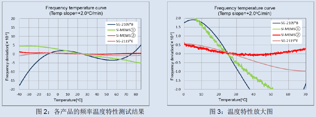 測試頻率溫度特性時,在-40℃的低溫下頻率穩定后,以+2.0℃/分的梯度使溫度連續上升至+85℃,測試該溫度段中的頻率,結果如《圖2》所示。