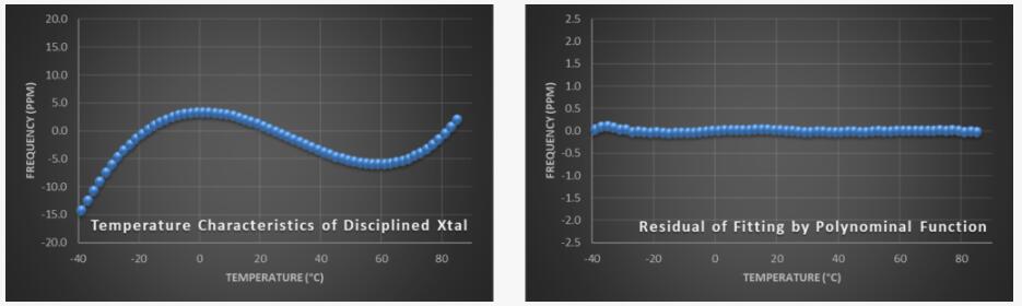 普通石英坯料可能存在輕微的缺陷或雜質(zhì),例如石英表面的拋光區(qū)域不足或晶坯中的晶格無序.這些微小的不規(guī)則性可能會導(dǎo)致特定溫度范圍內(nèi)的快速頻率跳躍,這不能用有限次多項式方程來描述.因此,TCXO溫補(bǔ)晶振的補(bǔ)償機(jī)制在這個特定的溫度范圍內(nèi)將是不準(zhǔn)確的.這種現(xiàn)象稱為“頻率擾動”,在下面的圖4中進(jìn)行了可視化.