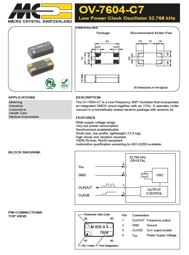| OV-7604-C7-32.768kHz-20PPM-TB-QC | Micro晶振 | 標(biāo)準(zhǔn)時鐘振蕩器 32.768 kHz +/-20 PPM -40/+125C |