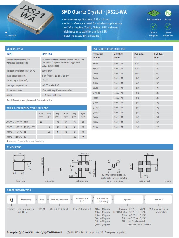 | Q 16.0-JXS21-12-10/15-T1-WA-LF | Jauch Quartz | JXS21-WA | 16MHz | ±10ppm | 12pF | -40°C ~ 85°C | 4 | (2.00mm x 1.60mm) |