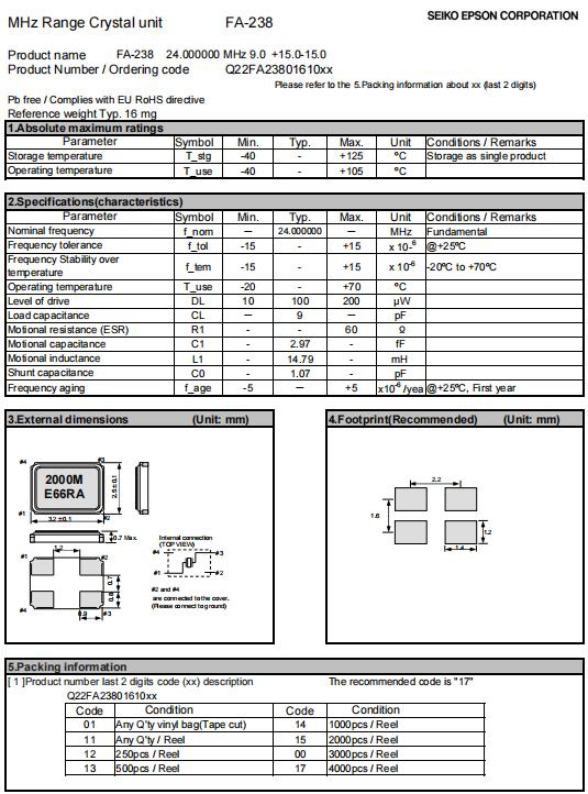 | Q22FA2380159716 | 3.2 x 2.5 x 0.7mm | FA-238 | 24.000000 MHz | 10 pF | +/-50 ppm | +/-30 ppm | -20 to +70 °C | ≤ 60 Ω |