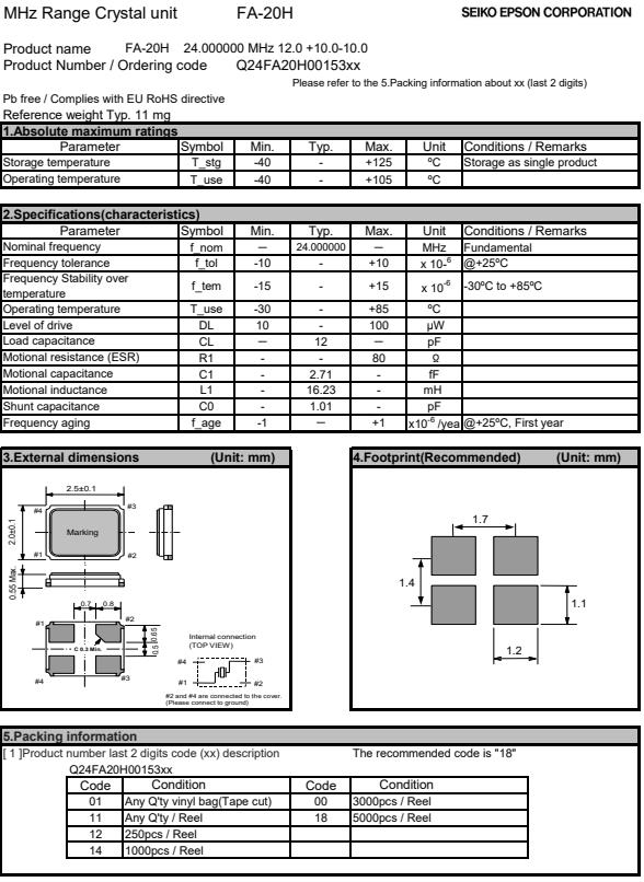| Q24FA20H0027100 | 2.5 x 2 x 0.55mm | FA-20H | 24.000000 MHz | 10 pF | +/-20 ppm | -30 to +70 °C |