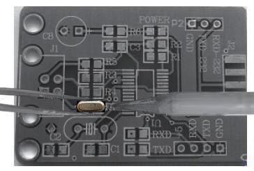 焊接和清除多余會造成短路的焊錫之后,石英晶體諧振器基本上就算是焊接好了.但是由于使用松香助焊和吸錫帶吸錫的緣故,致使電路板上的晶振腳位的周圍殘留了一些松香,雖然并不影響晶振的工作和正常使用,但也不是太美觀.而且有可能造成檢查時不方便.因此有必要對這些殘余物進行清理.常用的清理方法可以用洗板水,在這里,采用了酒精清洗,清洗工具可以用棉簽,也可以用鑷子夾著衛生紙之類進行.清洗擦除時應該注意的是酒精要適量,其濃度最好較高,以快速溶解松香之類的殘留物.其次,擦除的力道要控制好,不能太大,以免擦傷晶振焊接部分.此時可以用烙鐵或者熱風槍對酒精擦洗位置進行適當加熱以讓殘余酒精快速揮發.至此,石英晶振的焊接程序就算是結束了.