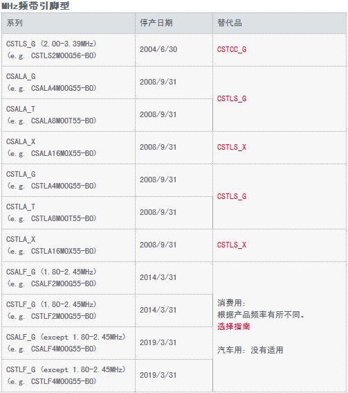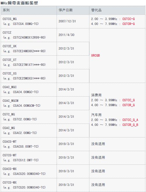 這次一共有三種類型的村田晶振被判出局,分別是MHZ頻帶表面貼裝型、MHZ頻帶引腳型、KHZ頻帶引腳型。接下來,壹兆電子會將Murata晶振停產的產品型號、日期和可代替產品料號完整的提供,請廣大新老客戶按照型號或系列對照,若有自己常用的型號請及時與我司壹兆電子業務人員聯系!