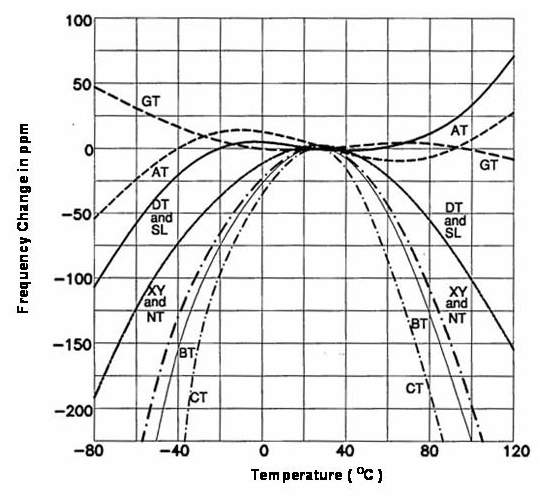 “FA-20H 32.0000MF20X-K3”大部份的石英晶體產品是用于電子線路上的參考頻率基準或頻率控制組件, 所以, 頻率與工作環境溫度的特性是一個很重要的參數. 事實上, 良好的頻率與溫度(frequeny versus temperature)特性也是選用石英做為頻率組件的主要因素之一. 經由適當的定義及設計, 石英晶體組件可以很容易的就滿足到以百萬分之一 (parts per million, ppm) 單位等級的頻率誤差范圍. 若以離散電路方式將LCR零件組成高頻振蕩線路, 雖然也可以在小量生產規模達到所需要的參考頻率信號誤差在ppm或sub-ppm等級要求, 可是這種方式無法滿足產業要達到的量產規模. 石英組件的頻率對溫度特性更是離散振蕩線路無法簡易達成的. 在(圖四) 中提供了數種不同的石英晶體切割角度的頻率對溫度特性曲線.